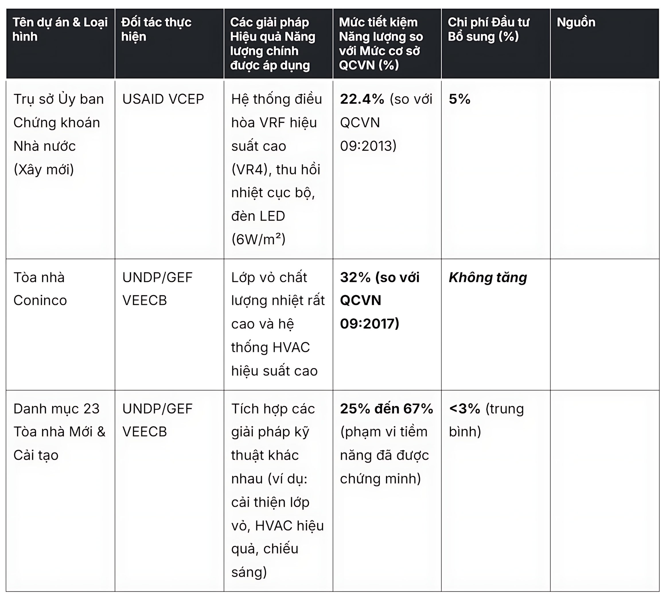 Lập luận rằng các công trình tại Việt Nam có thể đạt được hiệu suất vượt xa yêu cầu của QCVN 09 không phải là một giả định lý thuyết, mà là một thực tế đã được chứng minh qua nhiều dự án trình diễn do các tổ chức quốc tế hỗ trợ. Các dữ liệu từ những dự án này cung cấp bằng chứng thuyết phục về một khoảng trống hiệu suất đáng kể—một tiềm năng to lớn đang bị bỏ lỡ do khuôn khổ pháp lý hiện tại. Các dự án do Chương trình Năng lượng Sạch Việt Nam của USAID (VCEP) và Dự án Nâng cao Hiệu quả Năng lượng trong các Tòa nhà Thương mại và Chung cư cao tầng (EECB) của UNDP/GEF tài trợ đã cho thấy kết quả ấn tượng. Bằng cách áp dụng các giải pháp thiết kế tích hợp và công nghệ tiên tiến, các công trình này không